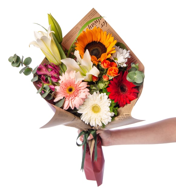 Girasol, margarita blanca y gerbera rosa en un elegante ramo