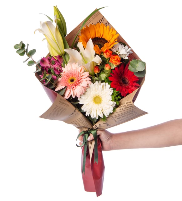 Ramo de Astromelias Rosas, Gerberas, Margaritas Blancas y Girasol