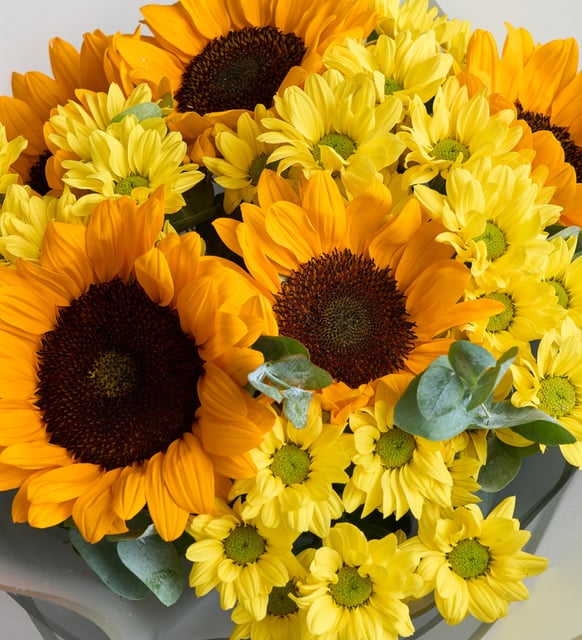 Girasol, margarita blanca y gerbera rosa en un elegante ramo