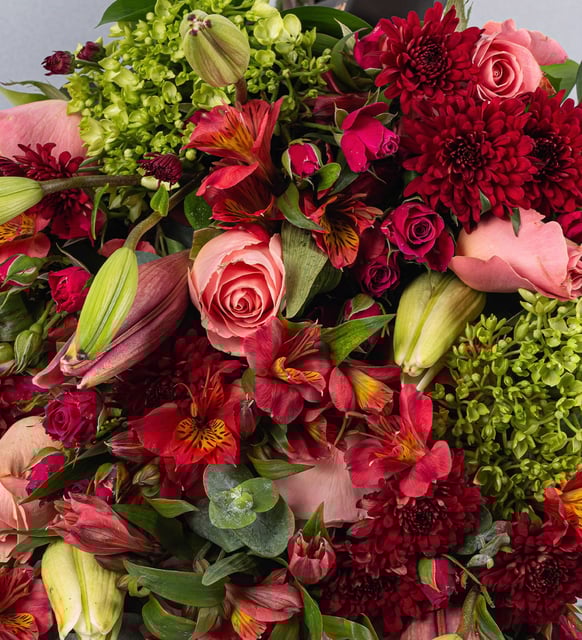 Ramo de rosas rojas y astromelias rosadas