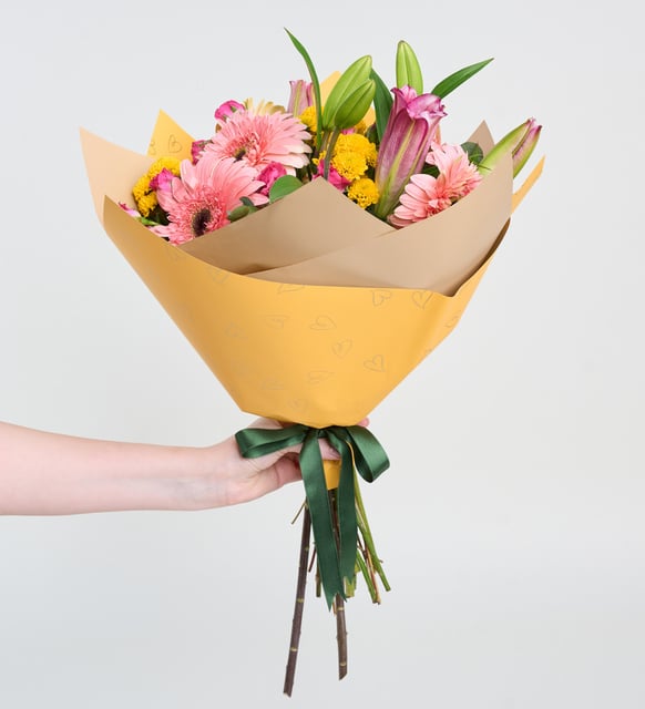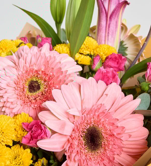 Gerbera rosa mini rosas y lirios en ramo amarillo