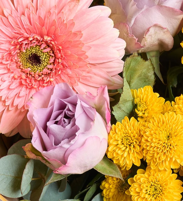 Gerbera Rosa, Rosas Lilas Y Crisantemo En Ramo Amarillo