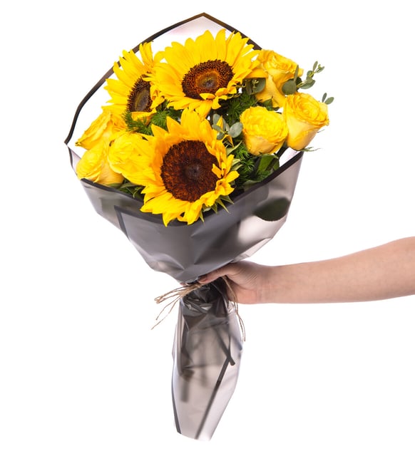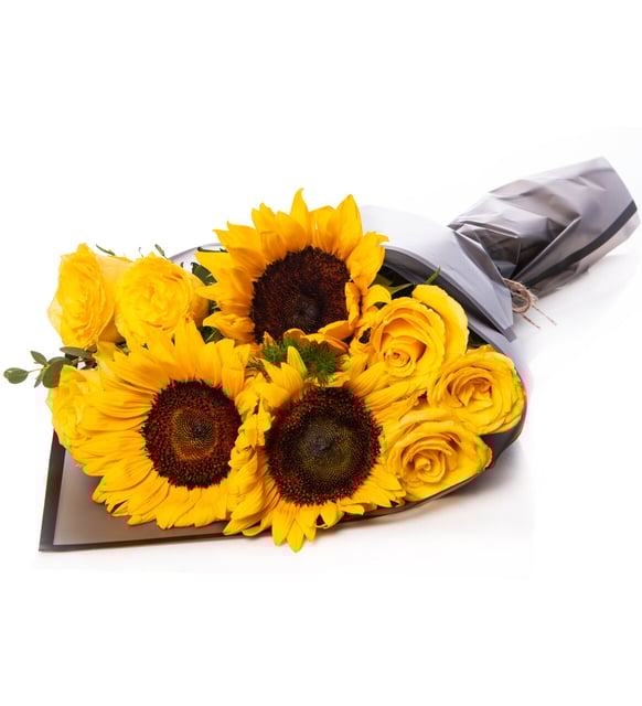 Ramo de girasoles y rosas amarillas