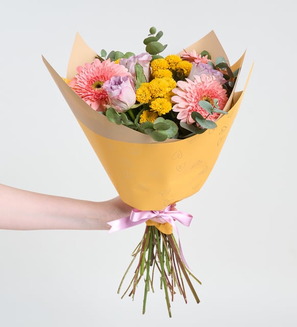 Gerbera rosa, rosas lilas y crisantemo en ramo amarillo