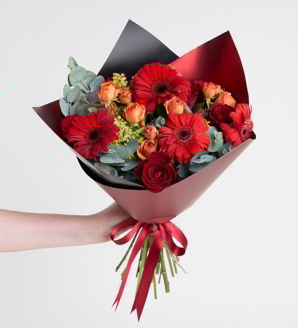 Rosas rojas, gerberas y rosas naranjas en ramo negro y rojo